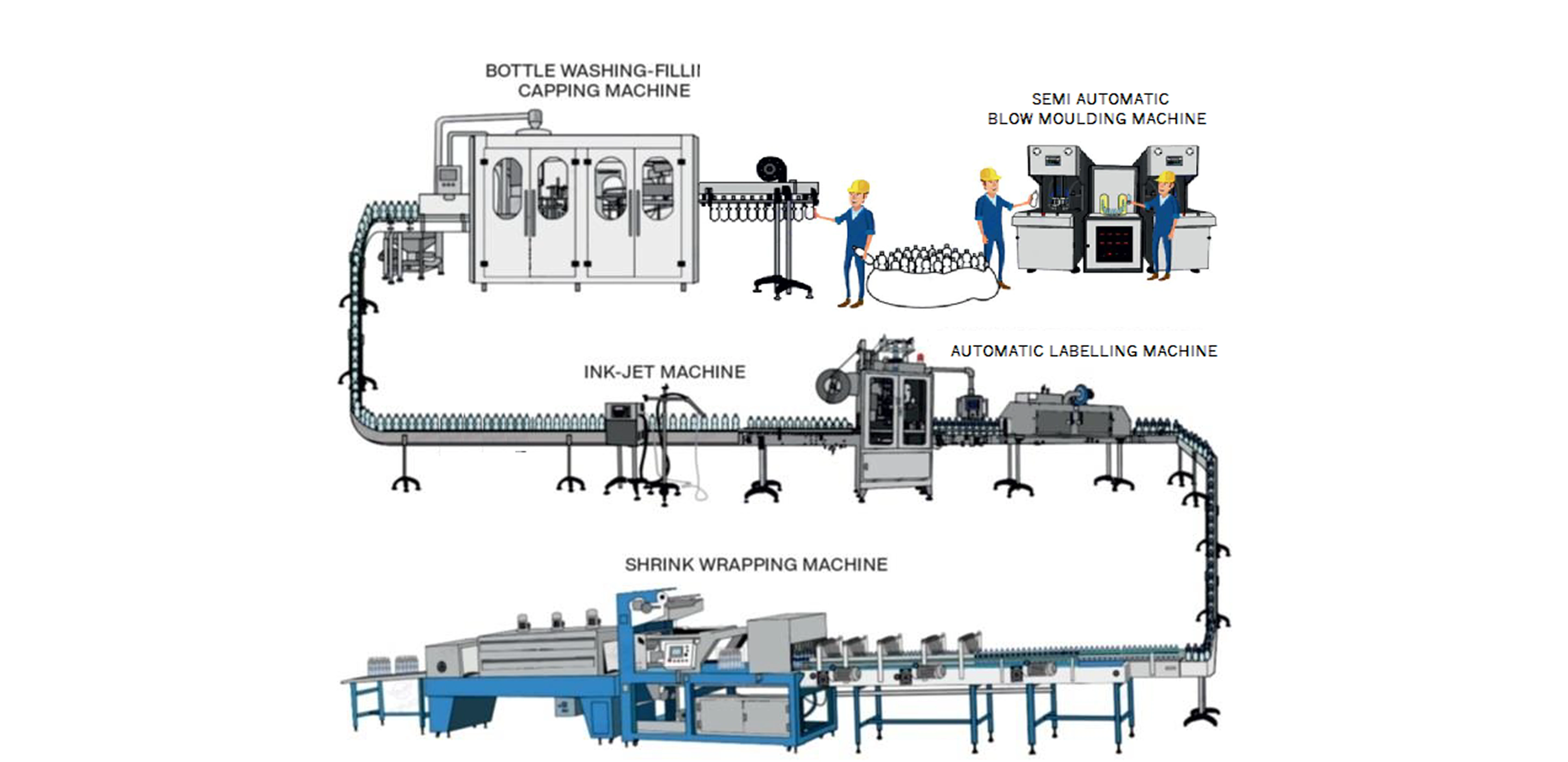 While the blow molding machine operates offline and independently, the rest of the plant—from bottle rinsing to final packaging—is fully automated, ensuring high throughput with minimal manual intervention.